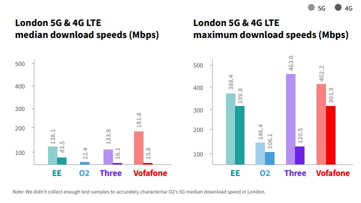 For maximum London 5G speeds, you’re looking at 388.4Mbps on EE, 146.4Mbps on O2, 463Mbps on Three, and 402.2Mbps on Vodafone. So Three was in the lead for top speed, but day to day you’d get a better experience on EE or Vodafone.